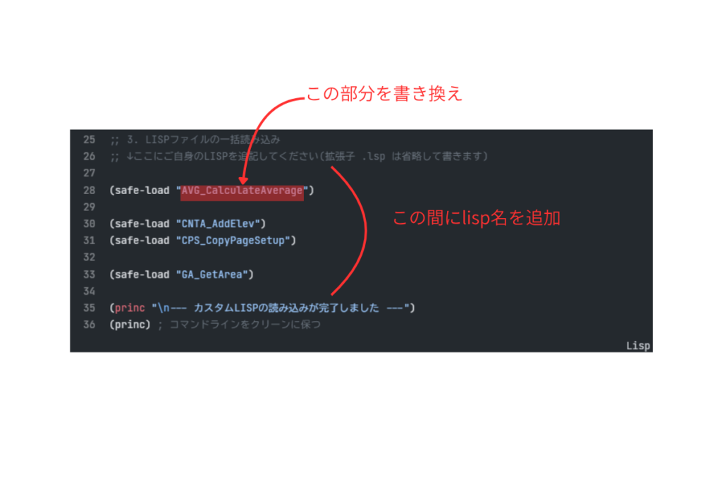 中身の(safe-load “○○○”)の部分(上のコードの場合27~34行目)をロードさせたいlispの拡張子を省略して書きます、不要なモノは消してください