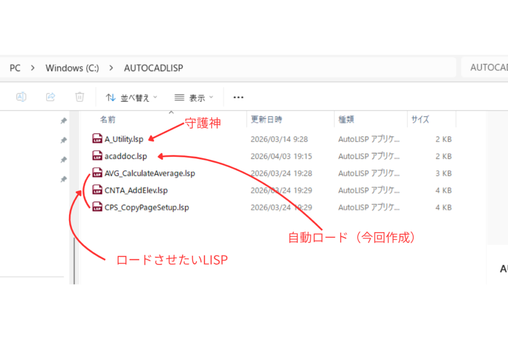今後新しいLISPを追加したいときは、管理フォルダー(例C:\AUTOCADLISP)に入れて、この acaddoc.lsp に (safe-load “○○○”) と1行書き足すだけでOKです。