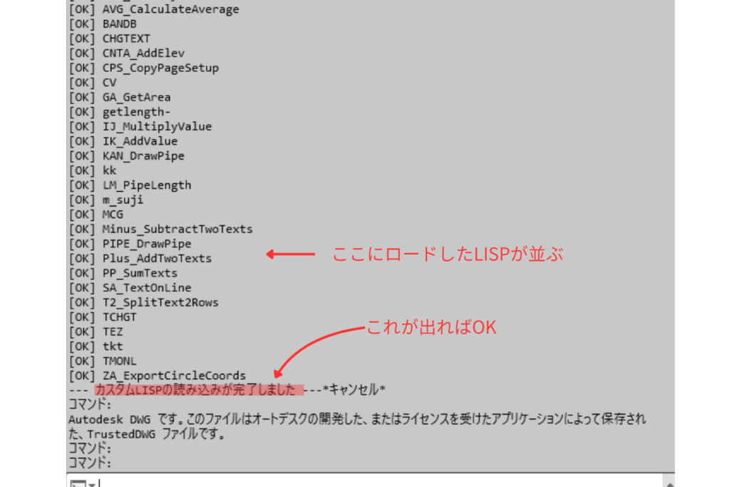 画面下のコマンドライン履歴(F2キー)を開いて、「— カスタムLISPの読み込みが完了しました —」 という文字が表示されていれば大成功です!